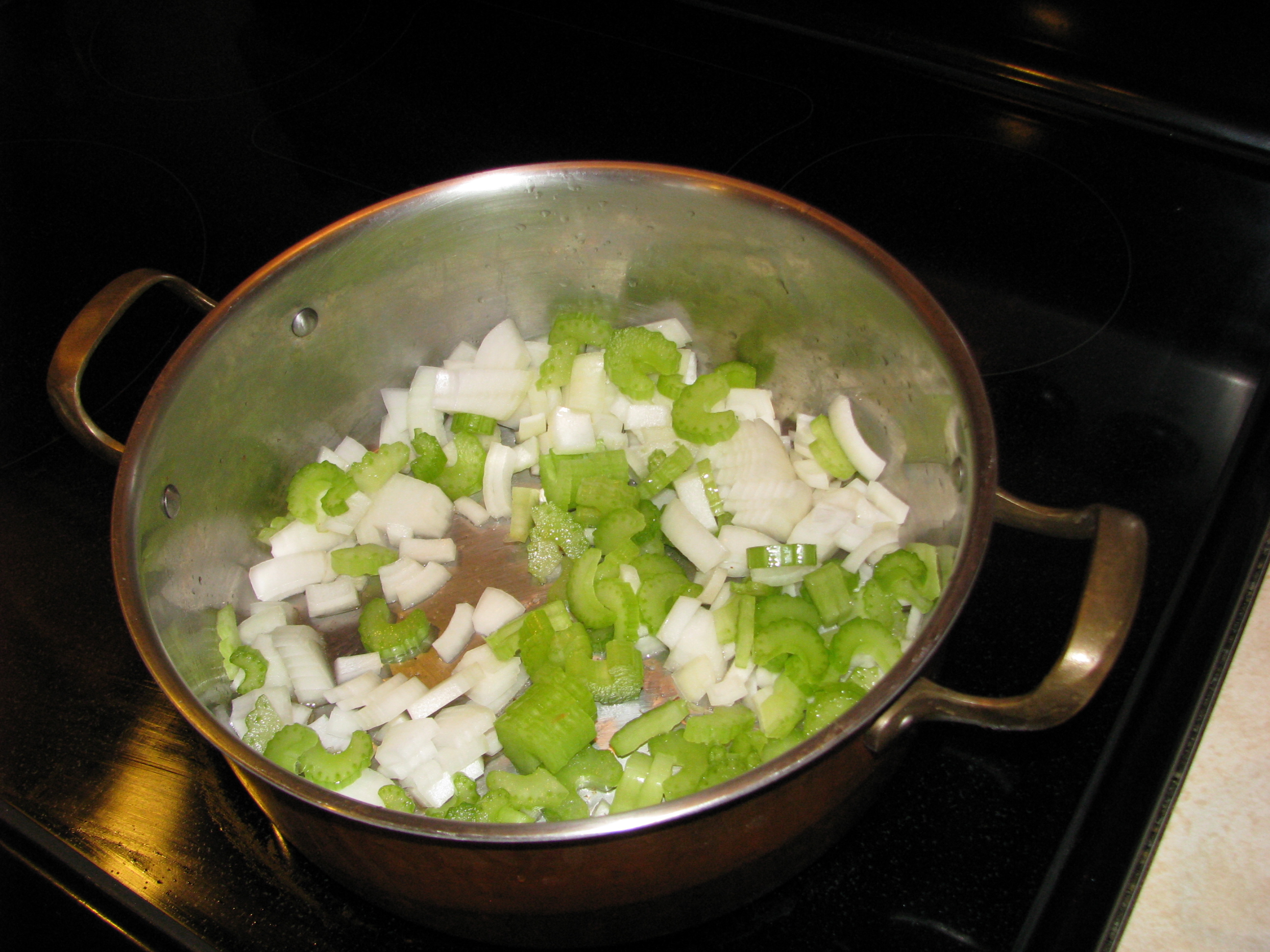In a large pot, add the bacon grease and sauté the chopped onion and celery until tender, then stir in flour.